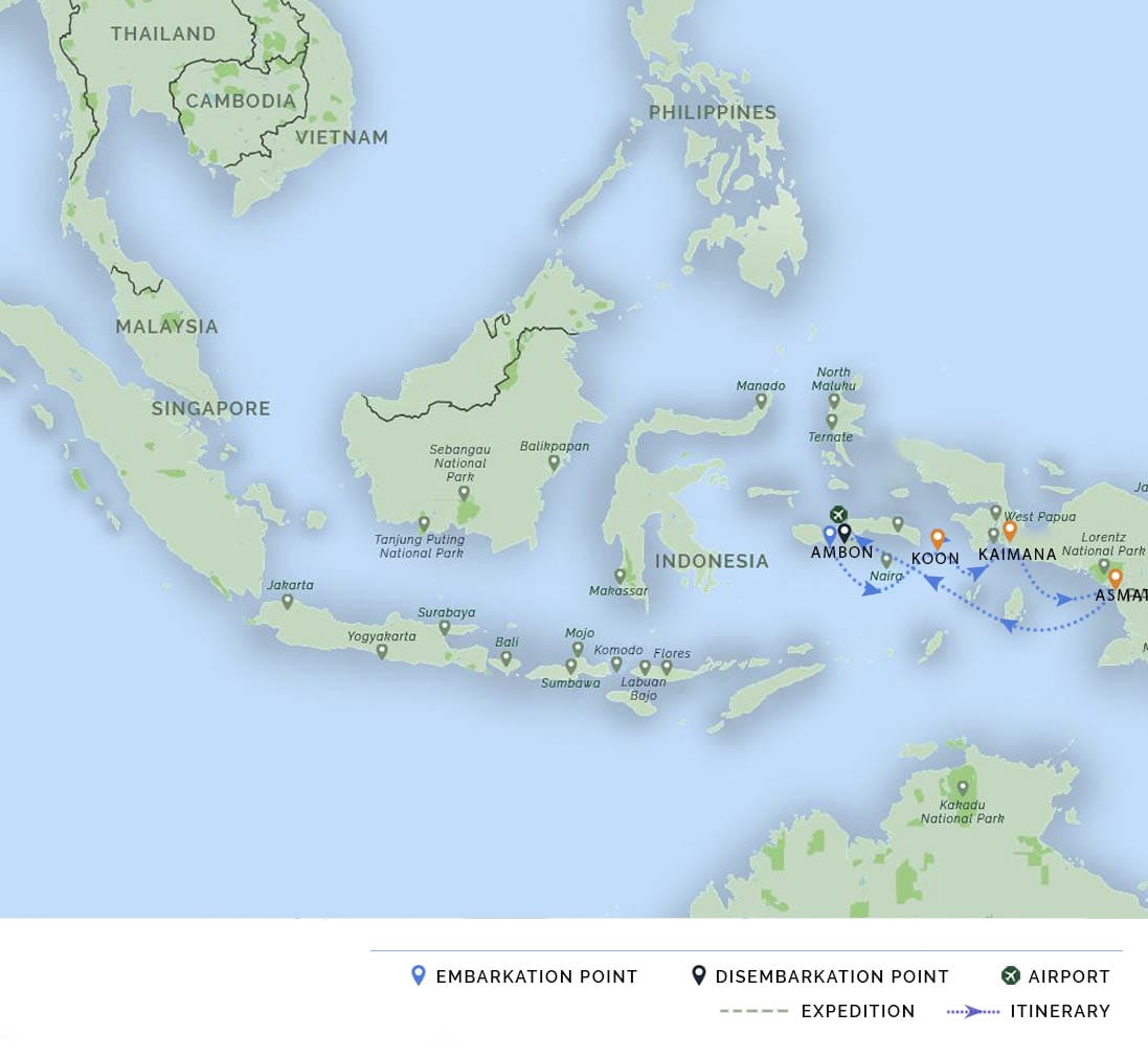 – West Papua & Asmat Tribe Expedition (8-day) — two sailings in the West Papua & uncharted Asmat region with explorations deep in the jungle in search of the enigmatic Asmat tribe.