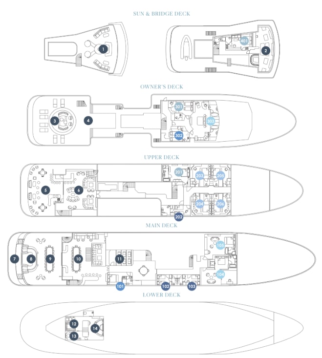 Located on the Main Deck, Category V cabins are ideal for two to three guests, offering a cozy and versatile layout with twin beds and an additional bunk bed for extra comfort. Designed with both functionality and style in mind, these cabins provide a welcoming retreat after a day of exploration.