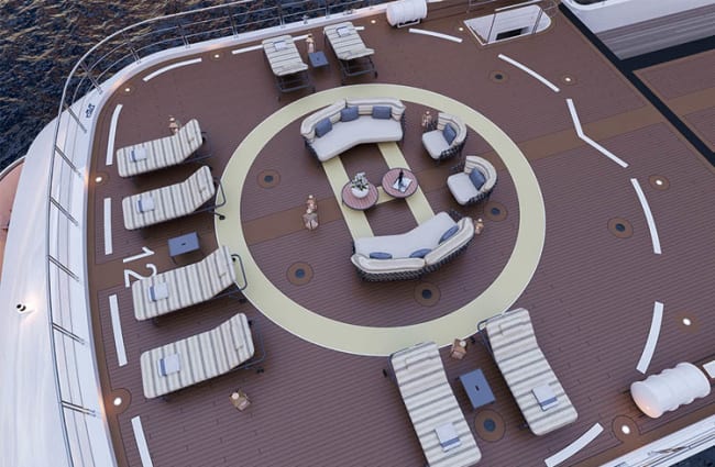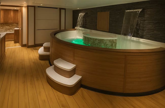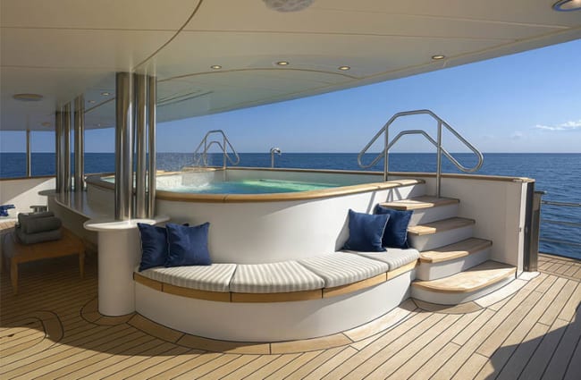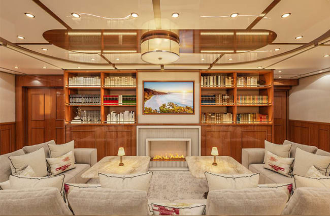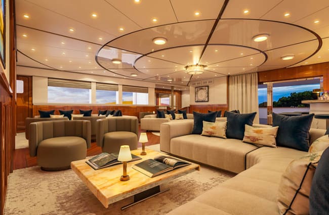 Guests unwind across six decks of refined spaces — an infinity plunge pool with panoramic views, open-air lounges, a spa and sauna, a gym, and a cinema. Social areas feel intimate and relaxed, inviting conversation, contemplation, and connection to the sea.