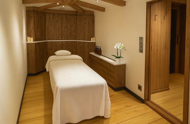 Each cabin offers generous closet space, a private ensuite bathroom, and modern amenities including an electronic safe, hairdryer, and other complimentary essentials. Individually designed and custom-furnished, every detail reflects craftsmanship and care — from the rich solid wood finishes to the elegant wallpapers and luxurious fabrics by Italy’s renowned Dedar. With warm tones and artful textures inspired by Europe and Africa, these cabins offer a timeless blend of sophistication and serenity.