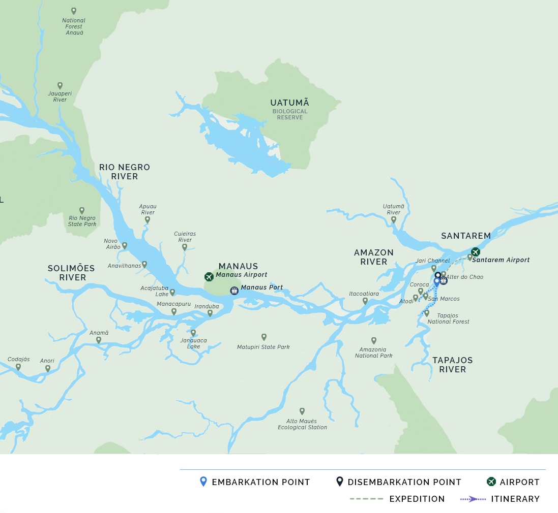 Sailing through the stunning Tapajós and Arapiuns Rivers in the Pará region of Brazil, Belle Amazon unlocks access to a side of the Amazon rarely visited by tourists. This lesser-known corridor offers some of the most breathtaking landscapes in the basin: white-sand river beaches, crystalline blackwater lagoons, and sprawling, untouched forests.