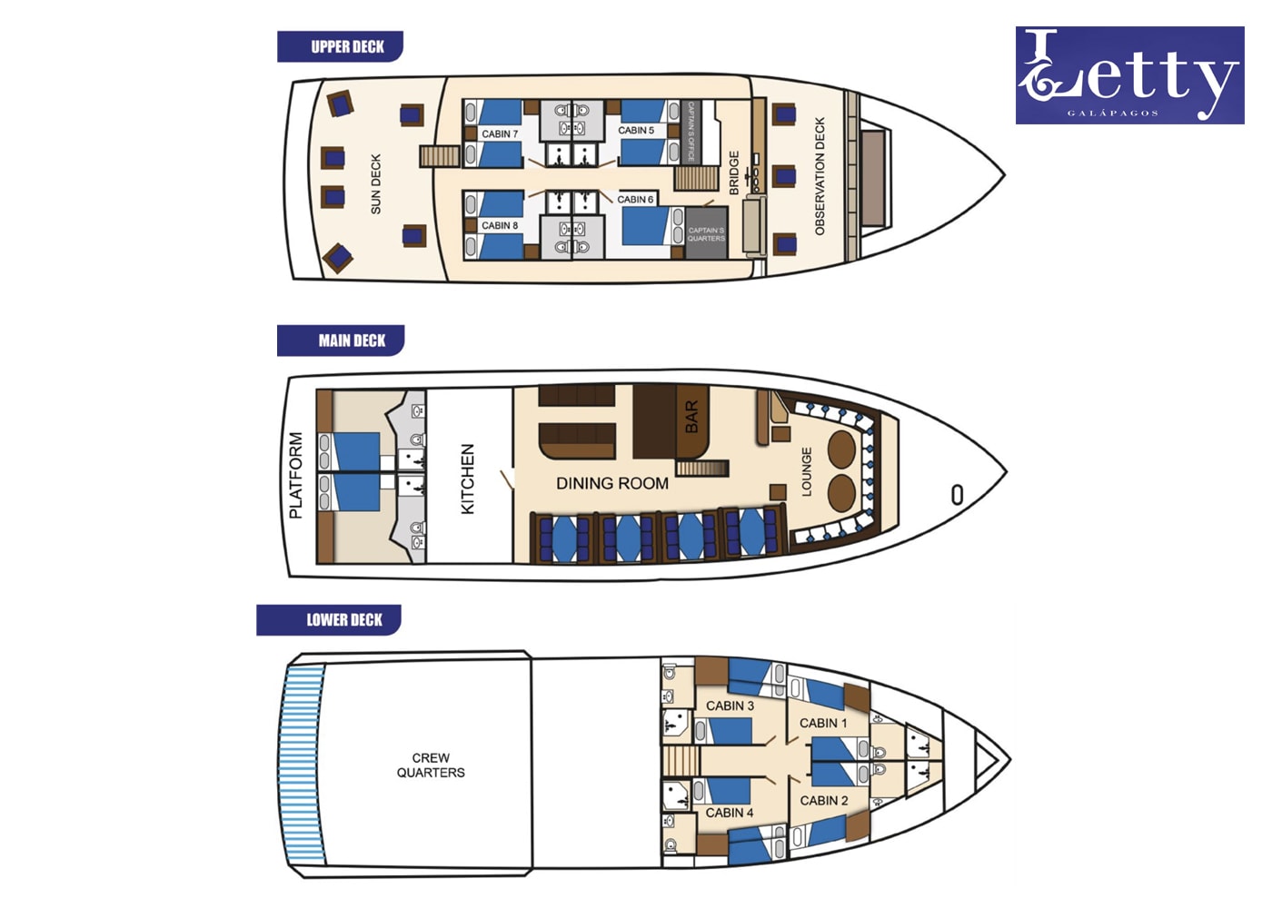 The Upper Deck cabins, are more spacious and can either have 2 twin beds or 1 double bed. All four cabins have ensuite bathrooms, air condition and portrait windows.