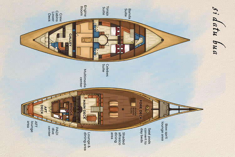 Si Datu Bua has three classically decorated, romantic guest cabins. Adorned with traditional woven textiles and Indonesian artefacts, these suites combine the warmth of solid wood with neutral cream tones, creating an elegant, relaxed ambiance. All suites feature air-conditioning, king-size beds and en-suite bathrooms. An extra bed suitable for a child can be installed for triple occupancy.