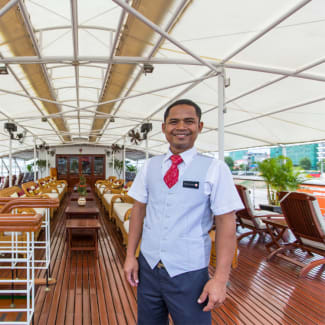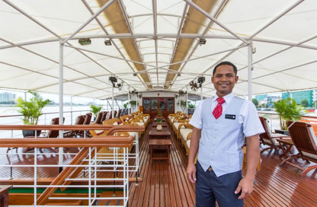 The friendly, English-speaking crew ensures your every need is met with warmth and care, while expert guides lead daily excursions that bring the culture and history of the region to life. Whether you’re exploring an ancient temple, visiting a local market, or simply sharing stories with fellow travelers over a drink, the experience is both enriching and deeply personal.