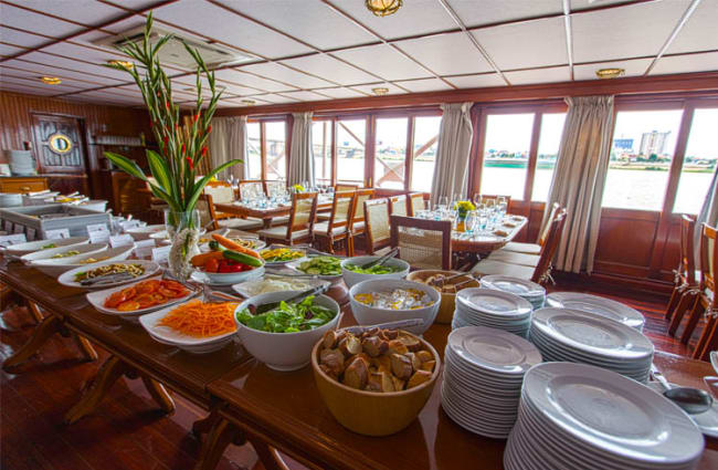 On the sundeck, you’ll find comfortable loungers perfect for watching the ever-changing scenery—the patchwork of rice paddies, local fishermen at work, and children waving from the shore. The dining room offers a relaxed setting where you can enjoy freshly prepared meals featuring a fusion of Southeast Asian flavors and familiar international dishes. A professional spa and library on the lower deck complete the amenities.