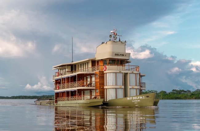 Your flight to the Amazon lands you in the jungle city of Iquitos, where you’ll transfer to our private port of Nauta. Here you will board the Delfin I, your boutique floating accommodations while in the Amazon. Choose between air-conditioned Master and Deluxe suites, each containing a separate bath with hot showers and a private terrace to enjoy time to yourselves. Honeymooners will especially like the lower deck Deluxe Master Suites which each have a private plunge pool.